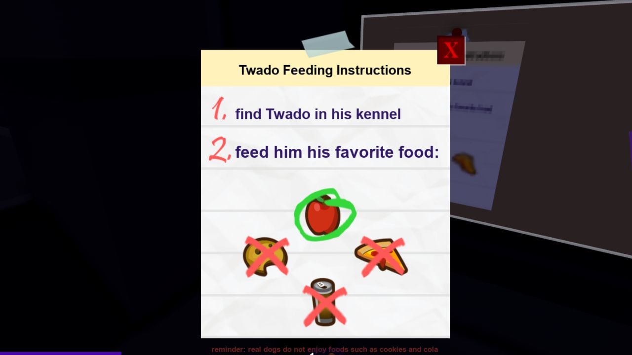 Поднимитесь на второй этаж главного зала и подойдите к доске объявлений. Нажимайте на бумаги, пока они не осыплются, а потом взаимодействуйте с заметкой под ними — там указана любимая еда Твадо.